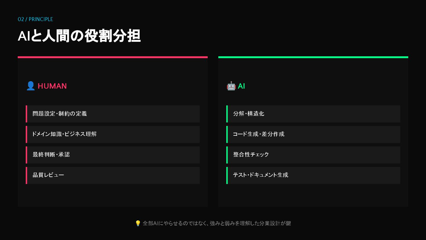 02 / PRINCIPLE AIと人間の役割分担 👤 HUMAN 問題設定・制約の定義 ドメイン知識・ビジネス理解 最終判断・承認 品質レビュー
