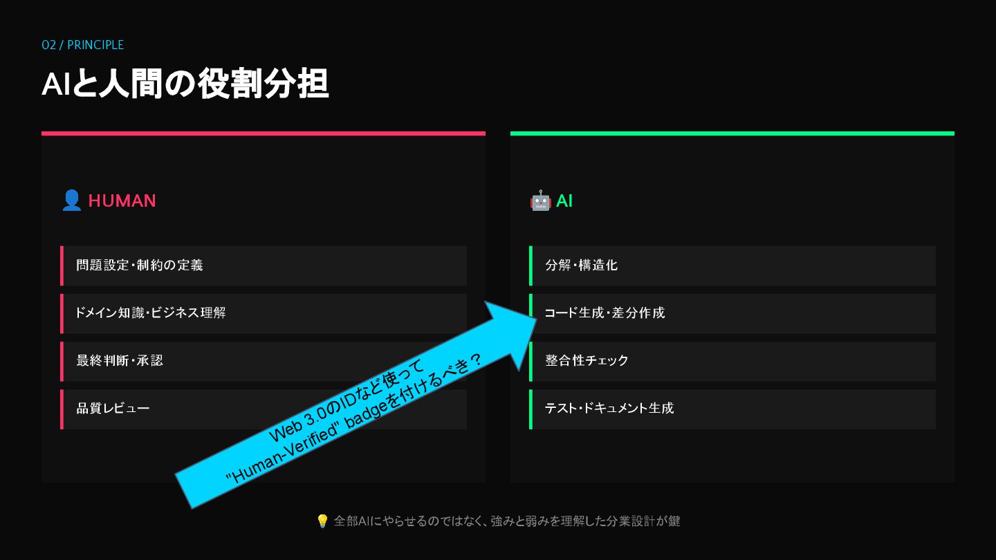 🤖 AI 分解・構造化 コード生成・差分作成 整合性チェック テスト・ドキュメント生成 💡 全部AIにやらせるのではなく、強みと弱みを理解した分業設計が鍵 Web 3.0のIDなど使って "Human-Verified" badgeを付けるべき?