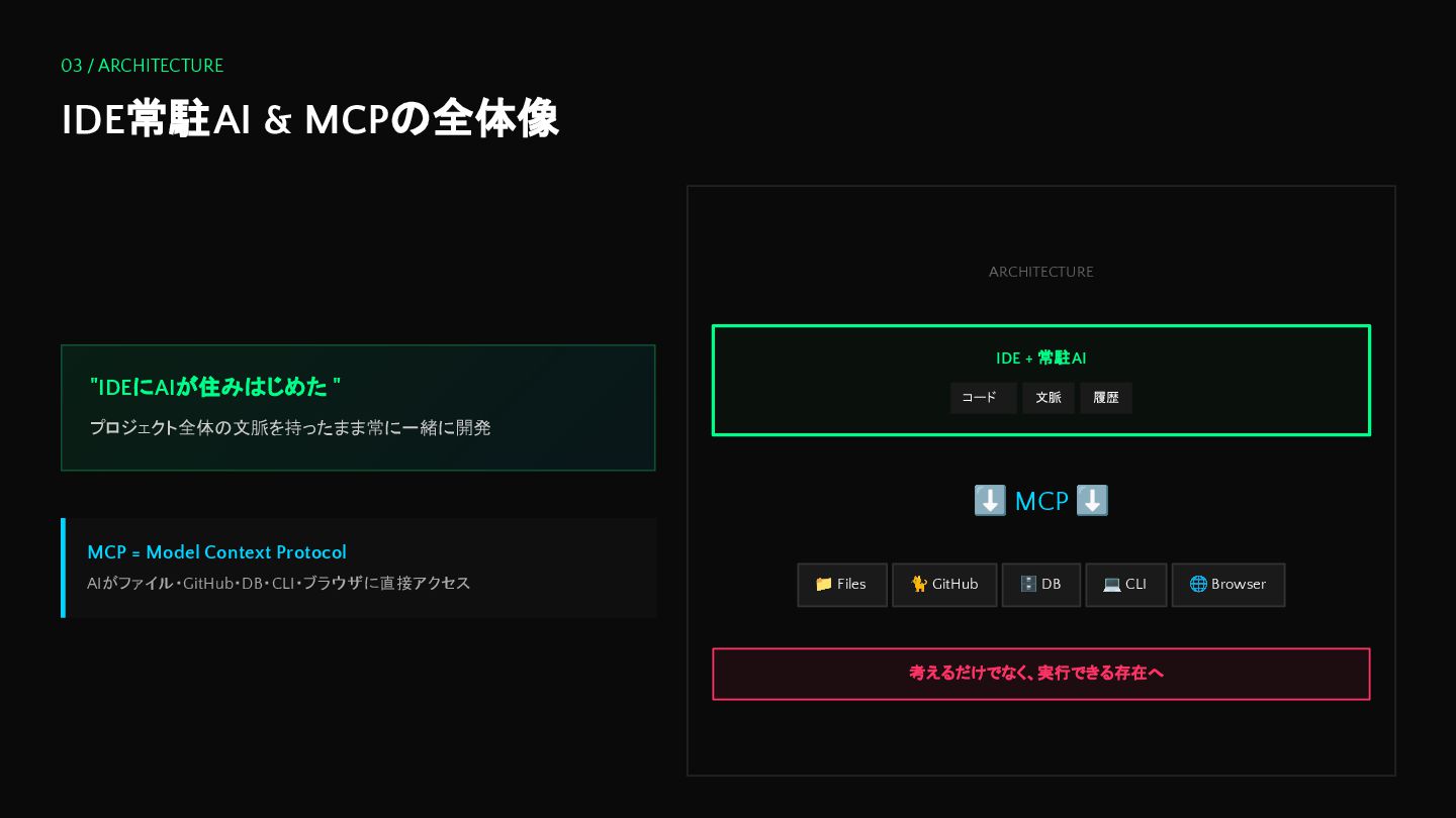 = Model Context Protocol AIがファイル・GitHub・DB・CLI・ブラウザに直接アクセス ARCHITECTURE IDE + 常駐AI コード 文脈 履歴 ⬇ MCP ⬇ 📁 Files 🐈 GitHub 🗄 DB 💻 CLI 🌐 Browser 考えるだけでなく、実行できる存在へ