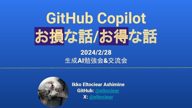 GitHub Copilot お損な話/お得な話 2024/2/28 生成AI勉強会&交流会 Ikko Eltociear Ashimine GitHub: @eltociear