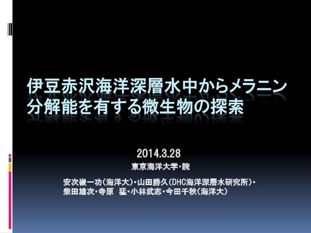 本研究の目的 海洋深層水からメラニン分解能を有すると考えら れる微生物を分離し、その分離株の諸性状を 確認すると共に、産生するメラニン分解成分の 詳細について調査することを目的としている。 9