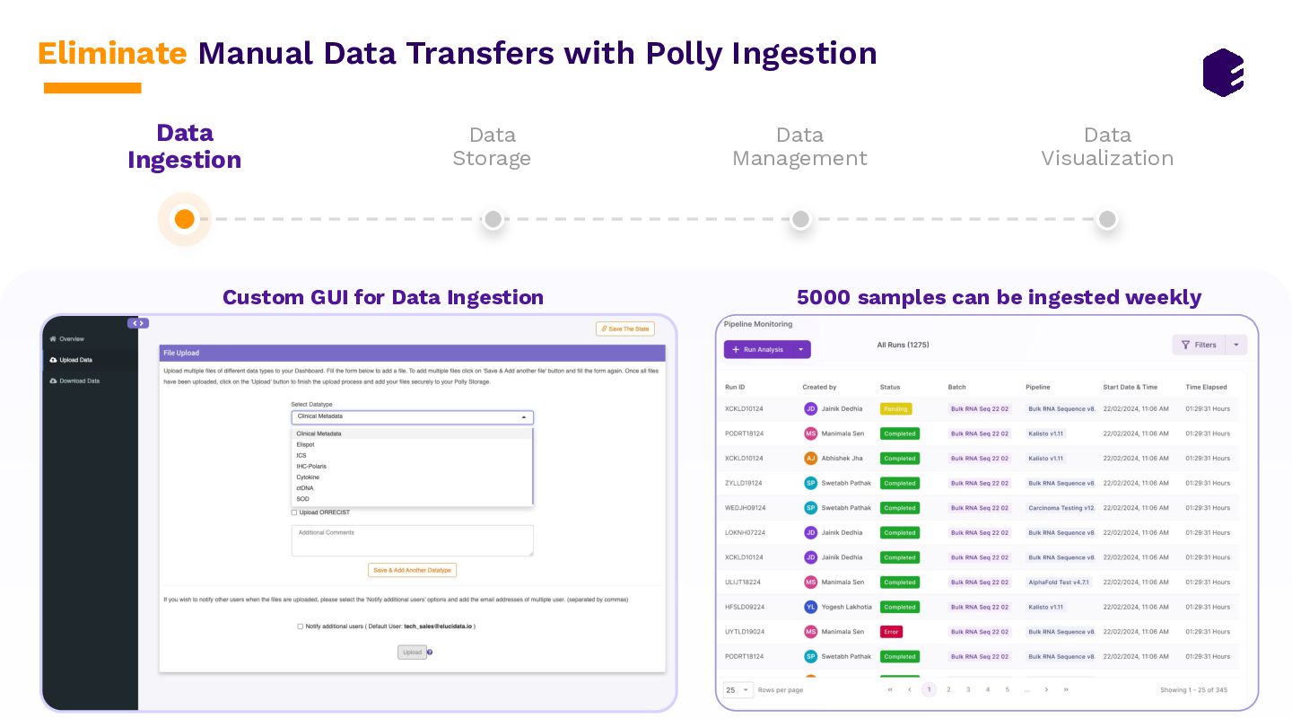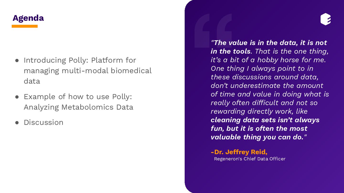 in the tools. That is the one thing, it’s a bit of a hobby horse for me. One thing I always point to in these discussions around data, don’t underestimate the amount of time and value in doing what is really often difficult and not so rewarding directly work, like cleaning data sets isn’t always fun, but it is often the most valuable thing you can do." -Dr. Jeffrey Reid, Regeneron's Chief Data Officer • Introducing Polly: Platform for managing multi-modal biomedical data • Example of how to use Polly: Analyzing Metabolomics Data • Discussion