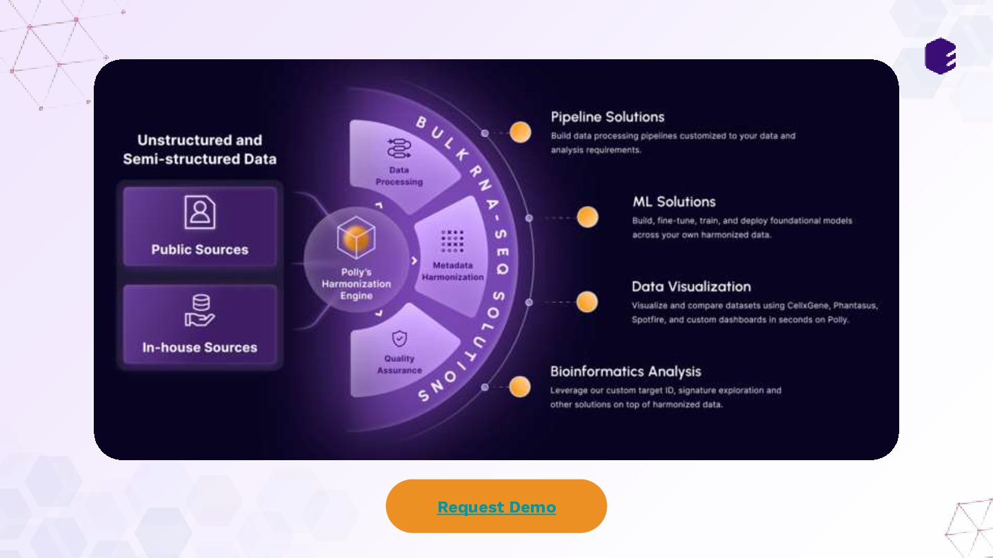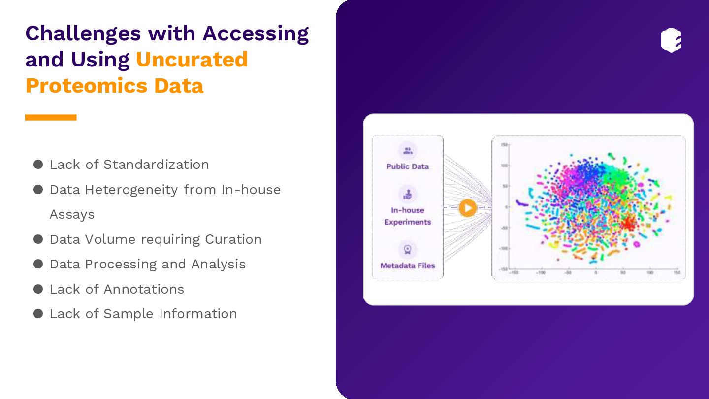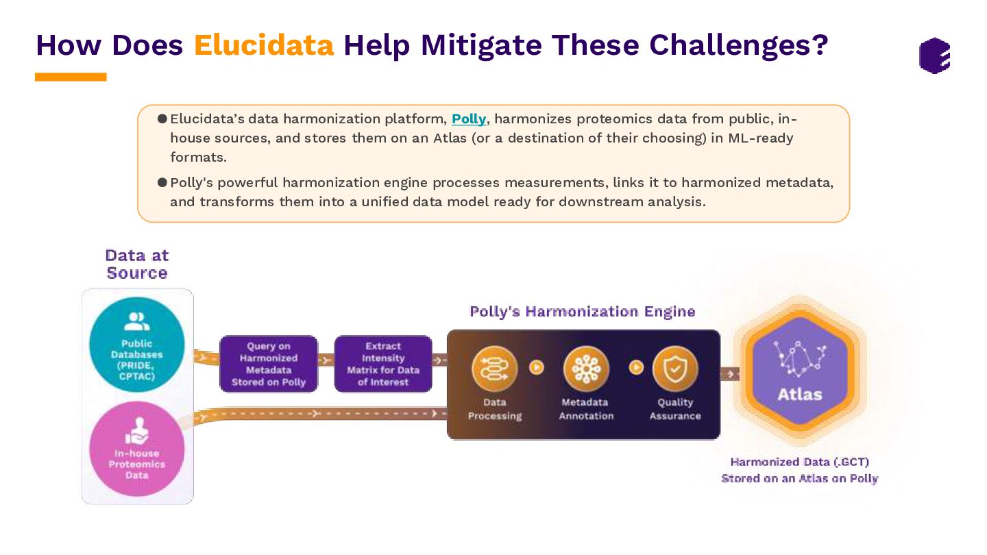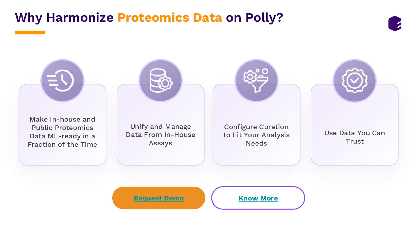 • A London-based therapeutics company faced a significant challenge in finding relevant proteomics datasets from the PRIDE repository, as only ~25% of these are completely annotated. • The company partnered with Elucidata to access high-quality, ML-ready proteomics data and completely annotated metadata to construct a comprehensive knowledge graph illustrating the intricate relationships and interactions between proteins in biological systems. • Elucidata employed a 3-step approach to deliver 60 high-quality proteomics datasets, each with over 10,000 samples. These datasets aligned with their inclusion criteria, ensuring that the datasets included disease labeling and all necessary information on samples. • Elucidata’s Polly Verified datasets allowed them to kickstart their research in 1 month versus 24 months, saving them over half a million dollars. Read full case-study here.