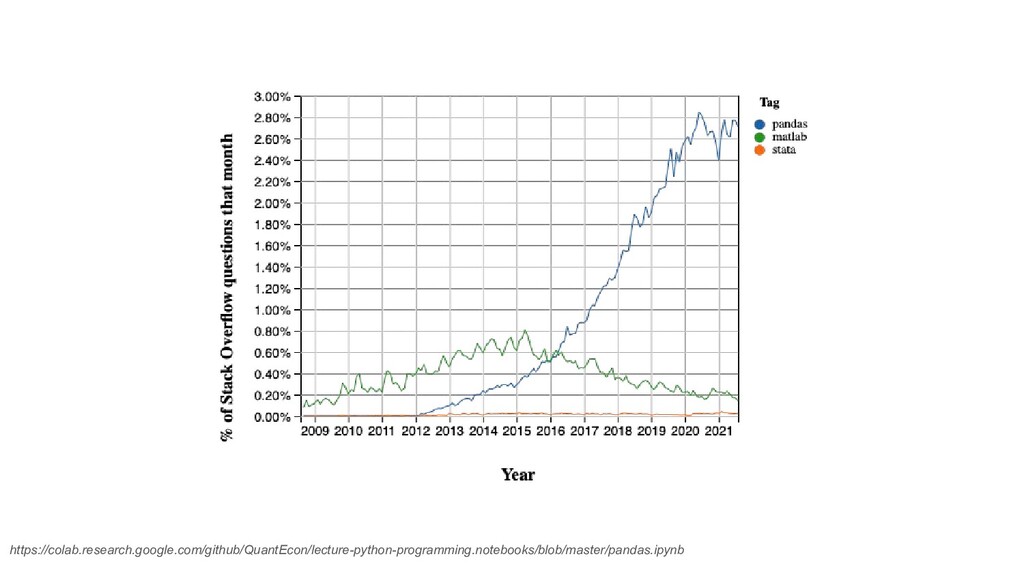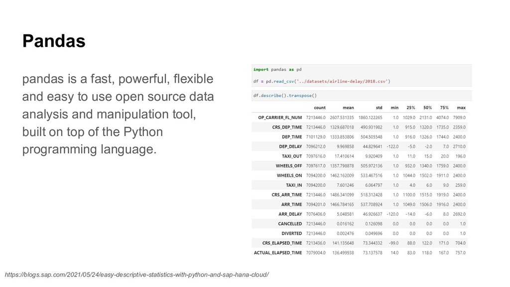 • Tools for reading and writing data between in-memory data structures and different file formats. • Data alignment and integrated handling of missing data. • Reshaping and pivoting of data sets. • Label-based slicing, fancy indexing, and subsetting of large data sets. • Data structure column insertion and deletion. • Group by engine allowing split-apply-combine operations on data sets. • Data set merging and joining. • Time series-functionality: Date range generation and frequency conversions, moving window statistics, moving window linear regressions, date shifting and lagging. • …. https://en.wikipedia.org/wiki/Pandas_(software)