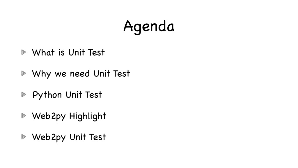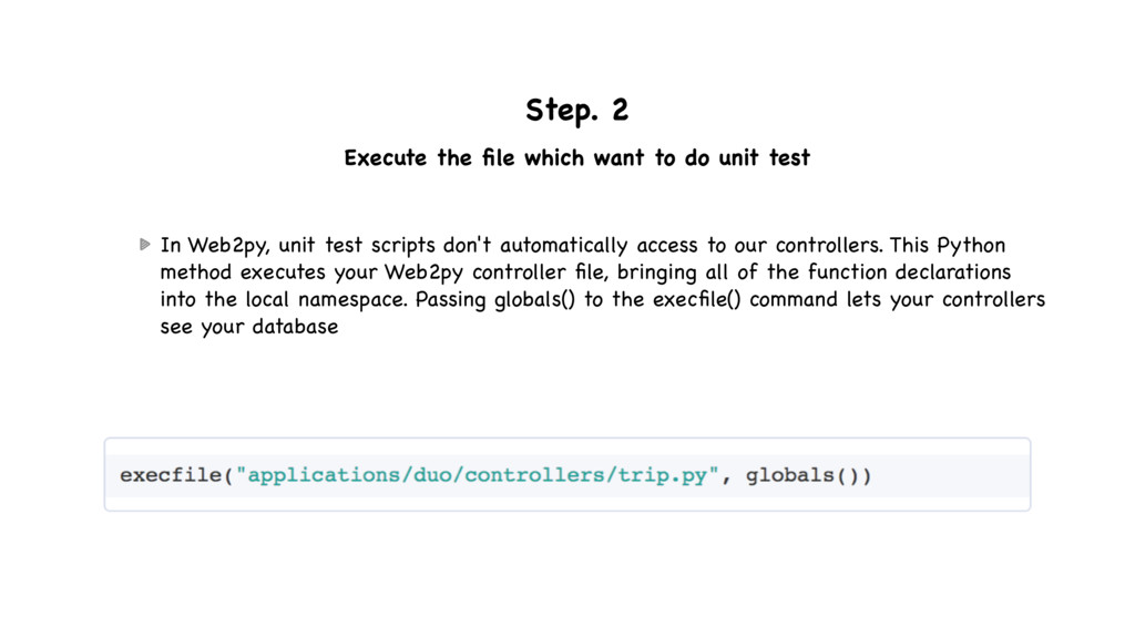 test In Web2py, unit test scripts don't automatically access to our controllers. This Python method executes your Web2py controller file, bringing all of the function declarations into the local namespace. Passing globals() to the execfile() command lets your controllers see your database