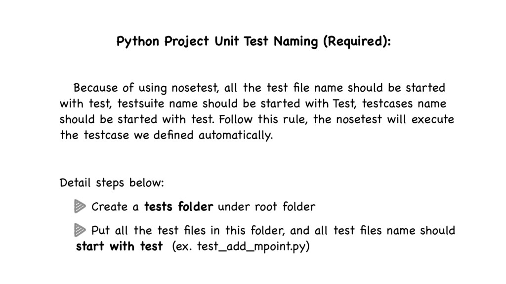 all the test file name should be started with test, testsuite name should be started with Test, testcases name should be started with test. Follow this rule, the nosetest will execute the testcase we defined automatically. Detail steps below: Create a tests folder under root folder Put all the test files in this folder, and all test files name should start with test (ex. test_add_mpoint.py)
