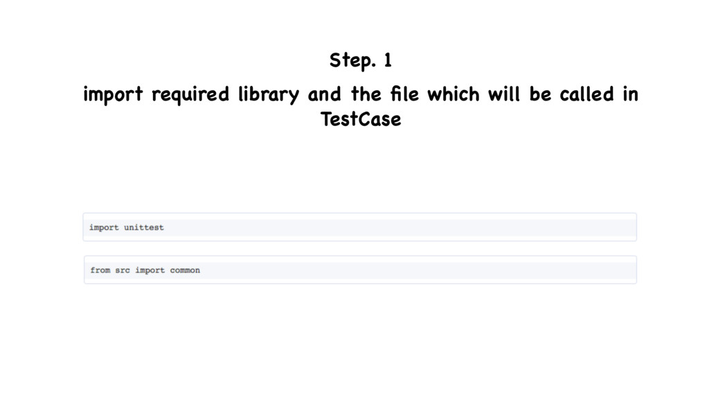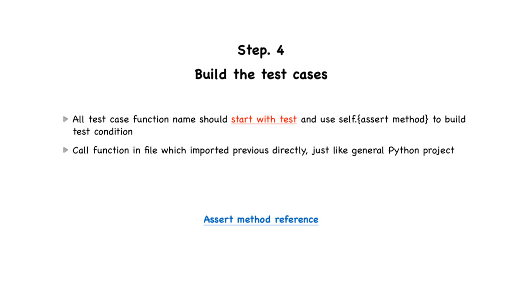 name should start with test and use self.{assert method} to build test condition Call function in file which imported previous directly, just like general Python project Assert method reference