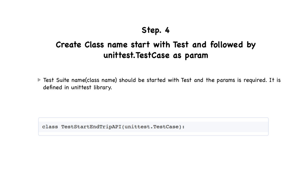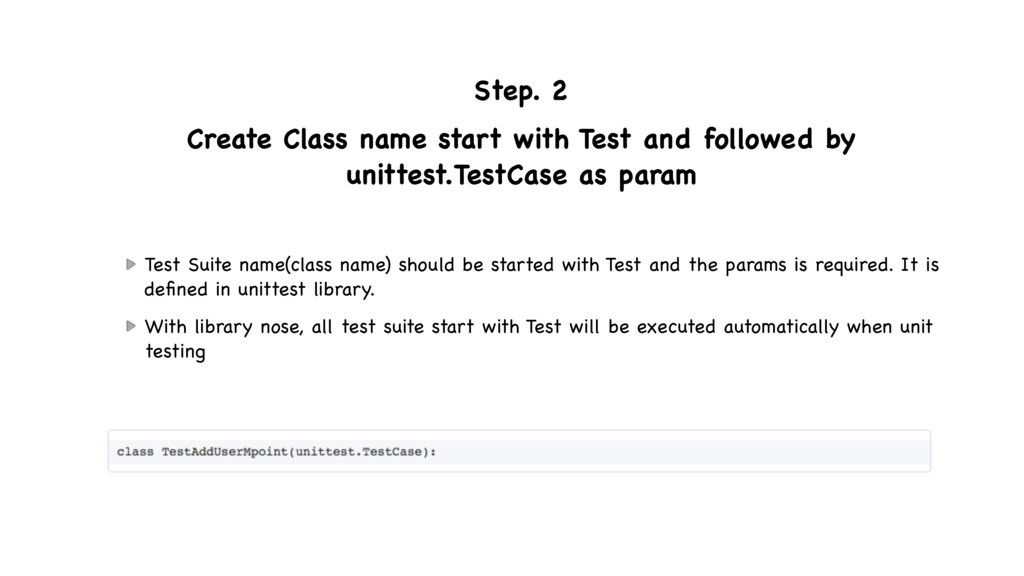 by unittest.TestCase as param Test Suite name(class name) should be started with Test and the params is required. It is defined in unittest library. With library nose, all test suite start with Test will be executed automatically when unit testing