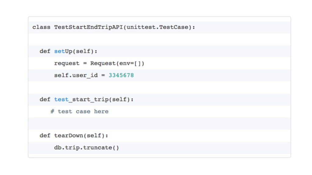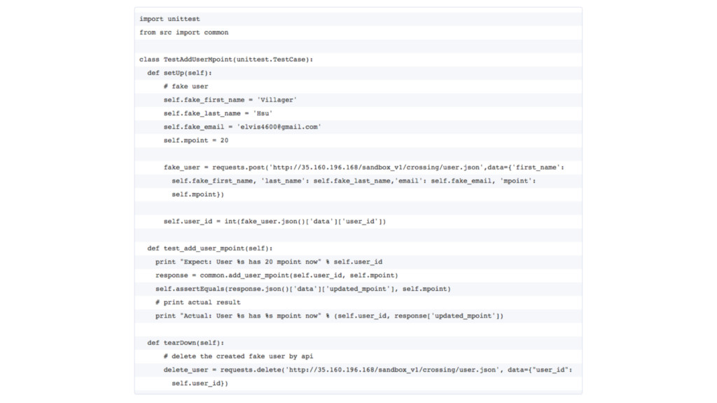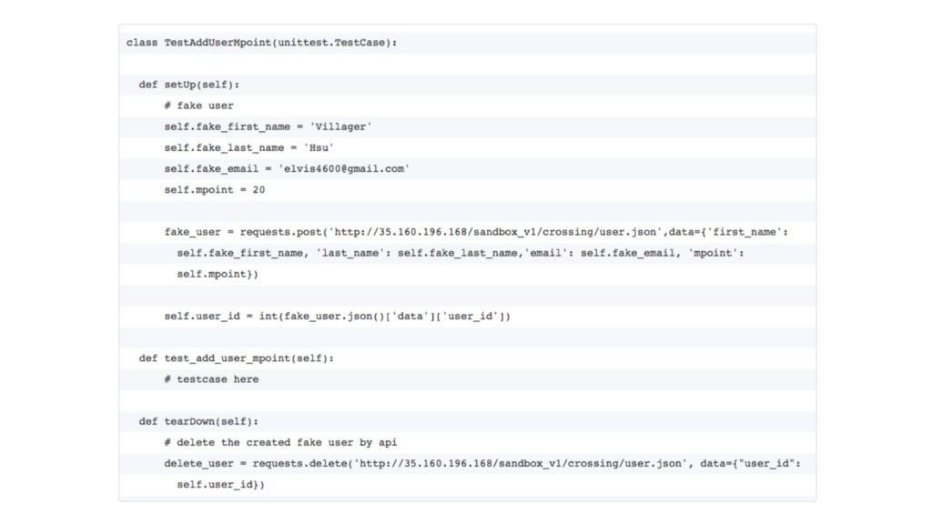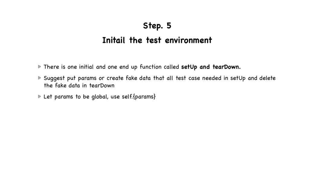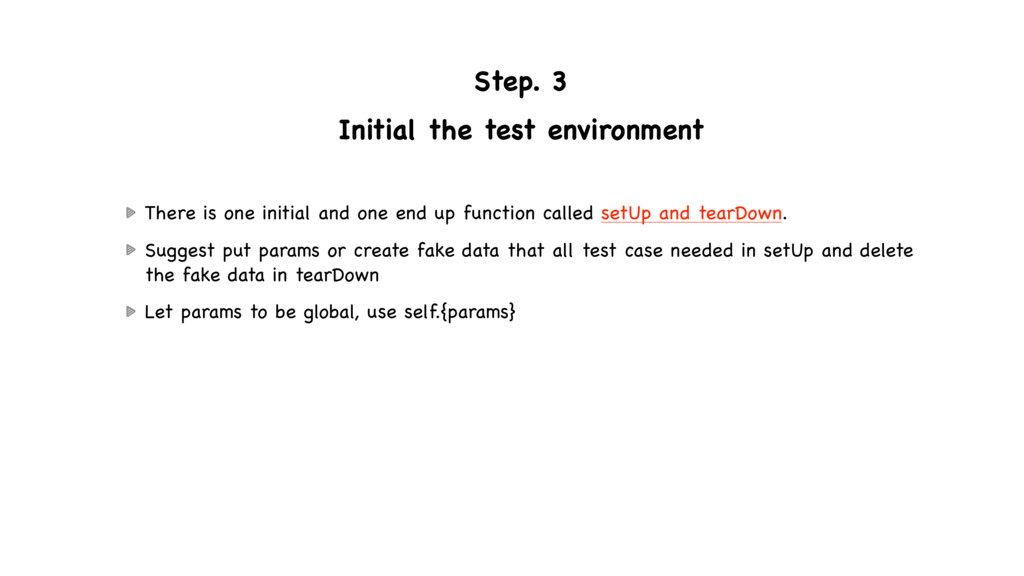 and one end up function called setUp and tearDown. Suggest put params or create fake data that all test case needed in setUp and delete the fake data in tearDown Let params to be global, use self.{params}