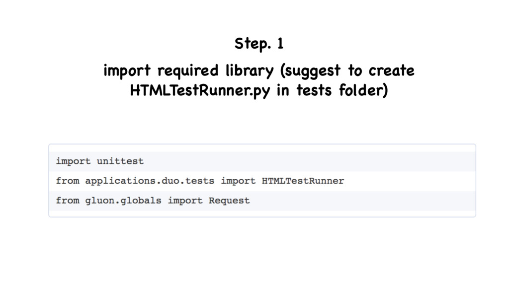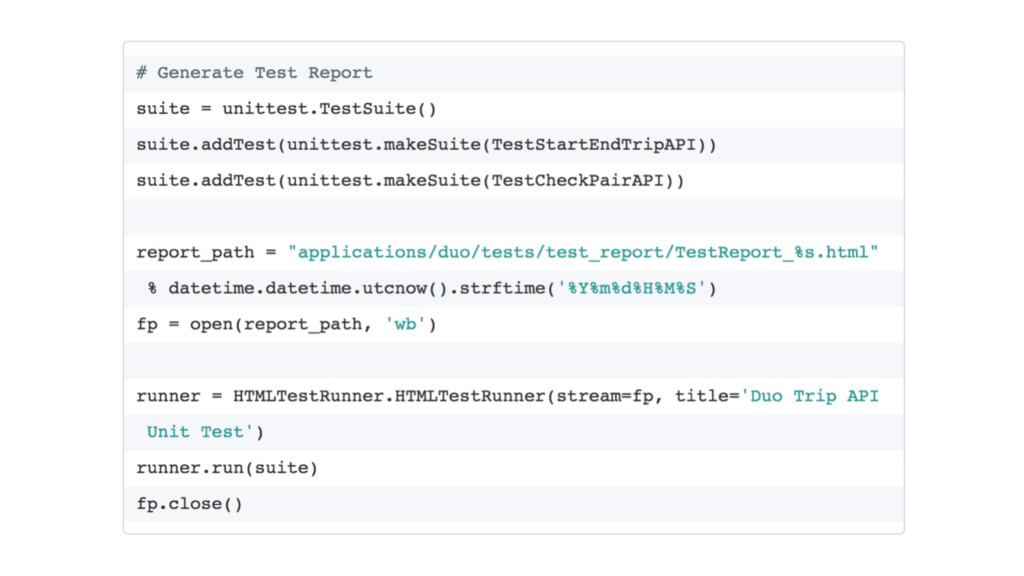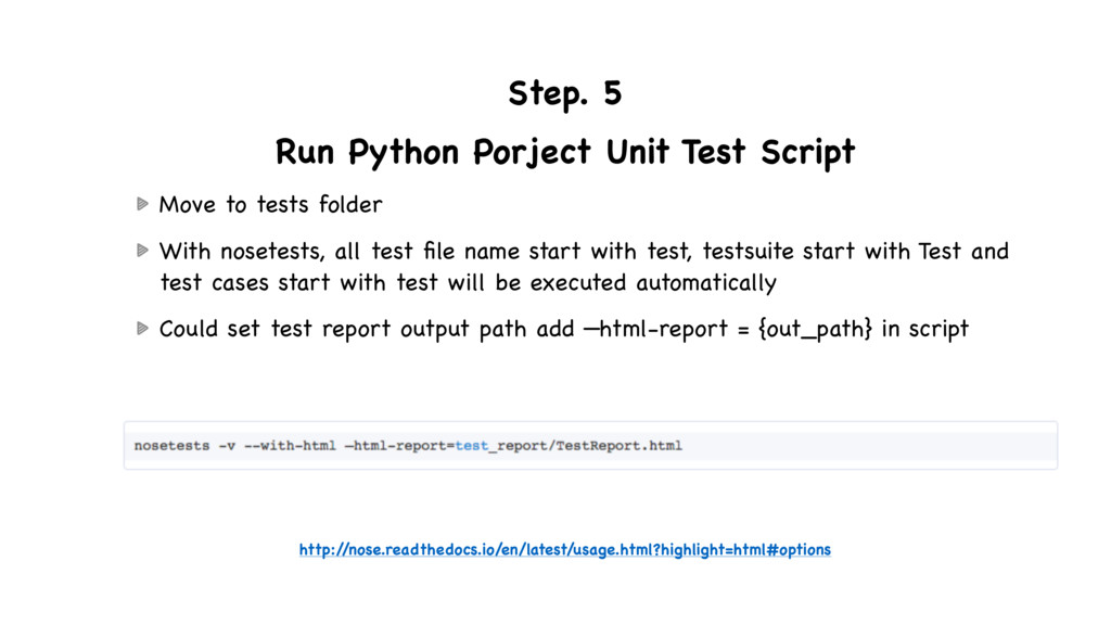 tests folder With nosetests, all test file name start with test, testsuite start with Test and test cases start with test will be executed automatically Could set test report output path add —html-report = {out_path} in script http:/ /nose.readthedocs.io/en/latest/usage.html?highlight=html#options