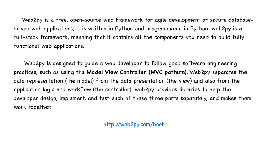 of secure database- driven web applications; it is written in Python and programmable in Python. web2py is a full-stack framework, meaning that it contains all the components you need to build fully functional web applications. Web2py is designed to guide a web developer to follow good software engineering practices, such as using the Model View Controller (MVC pattern). Web2py separates the data representation (the model) from the data presentation (the view) and also from the application logic and workflow (the controller). web2py provides libraries to help the developer design, implement, and test each of these three parts separately, and makes them work together. http:/ /web2py.com/book