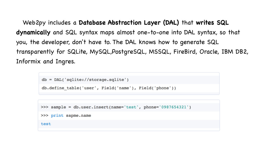 dynamically and SQL syntax maps almost one-to-one into DAL syntax, so that you, the developer, don't have to. The DAL knows how to generate SQL transparently for SQLite, MySQL,PostgreSQL, MSSQL, FireBird, Oracle, IBM DB2, Informix and Ingres.