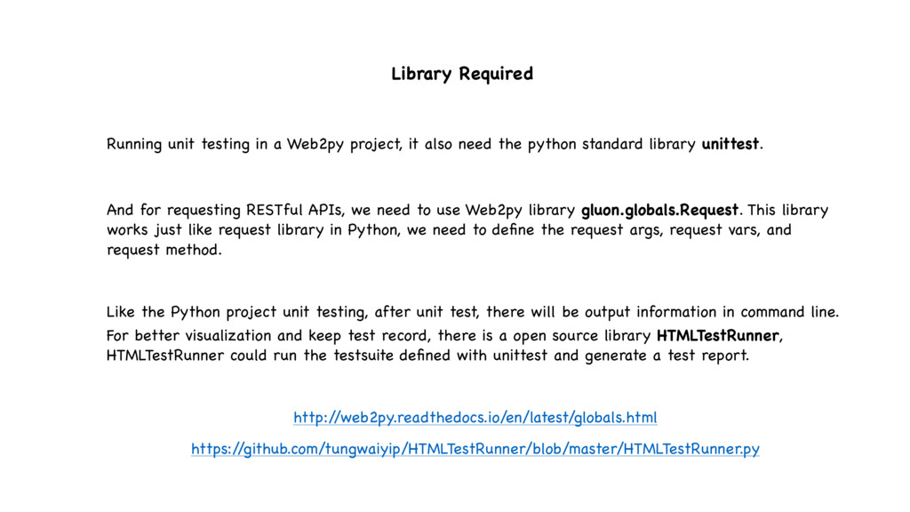 also need the python standard library unittest. And for requesting RESTful APIs, we need to use Web2py library gluon.globals.Request. This library works just like request library in Python, we need to define the request args, request vars, and request method. Like the Python project unit testing, after unit test, there will be output information in command line. For better visualization and keep test record, there is a open source library HTMLTestRunner, HTMLTestRunner could run the testsuite defined with unittest and generate a test report. http:/ /web2py.readthedocs.io/en/latest/globals.html https:/ /github.com/tungwaiyip/HTMLTestRunner/blob/master/HTMLTestRunner.py