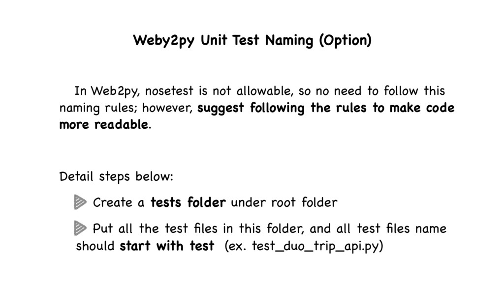 allowable, so no need to follow this naming rules; however, suggest following the rules to make code more readable. Detail steps below: Create a tests folder under root folder Put all the test files in this folder, and all test files name should start with test (ex. test_duo_trip_api.py)