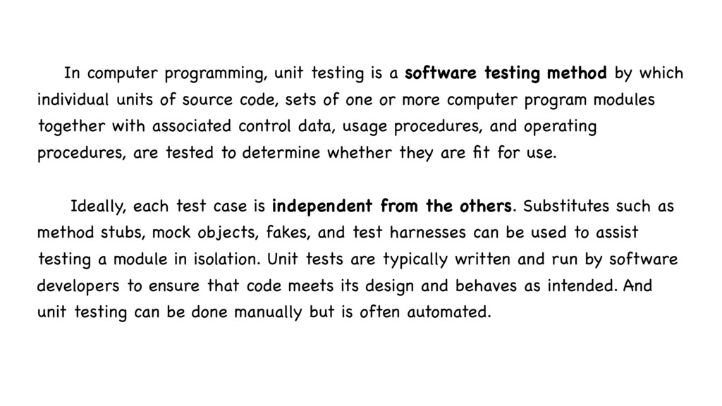 by which individual units of source code, sets of one or more computer program modules together with associated control data, usage procedures, and operating procedures, are tested to determine whether they are fit for use. Ideally, each test case is independent from the others. Substitutes such as method stubs, mock objects, fakes, and test harnesses can be used to assist testing a module in isolation. Unit tests are typically written and run by software developers to ensure that code meets its design and behaves as intended. And unit testing can be done manually but is often automated.