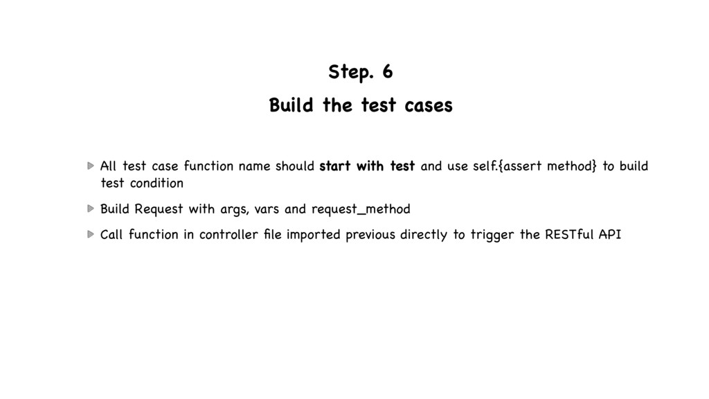 name should start with test and use self.{assert method} to build test condition Build Request with args, vars and request_method Call function in controller file imported previous directly to trigger the RESTful API