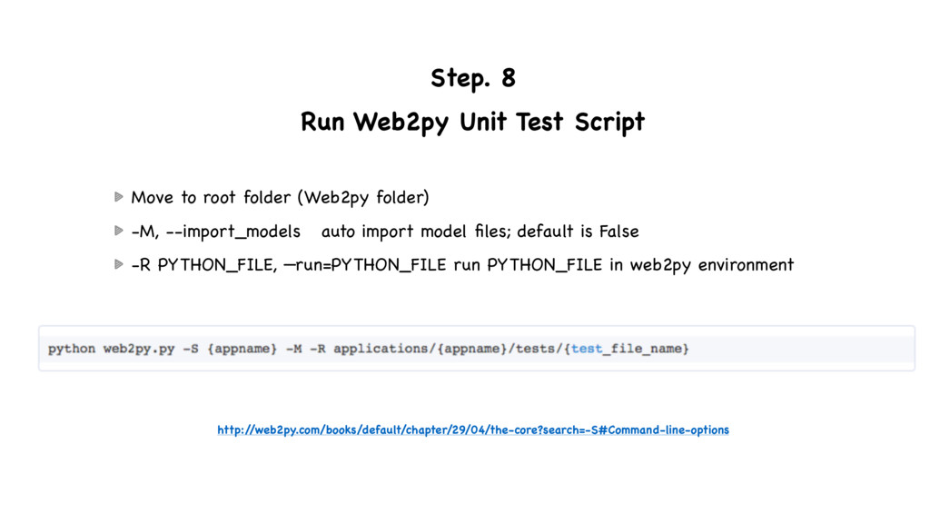 folder (Web2py folder) -M, --import_models auto import model files; default is False -R PYTHON_FILE, —run=PYTHON_FILE run PYTHON_FILE in web2py environment http:/ /web2py.com/books/default/chapter/29/04/the-core?search=-S#Command-line-options