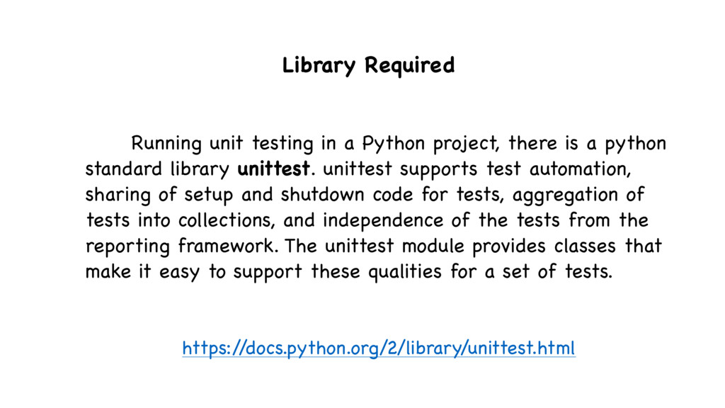 is a python standard library unittest. unittest supports test automation, sharing of setup and shutdown code for tests, aggregation of tests into collections, and independence of the tests from the reporting framework. The unittest module provides classes that make it easy to support these qualities for a set of tests. https:/ /docs.python.org/2/library/unittest.html