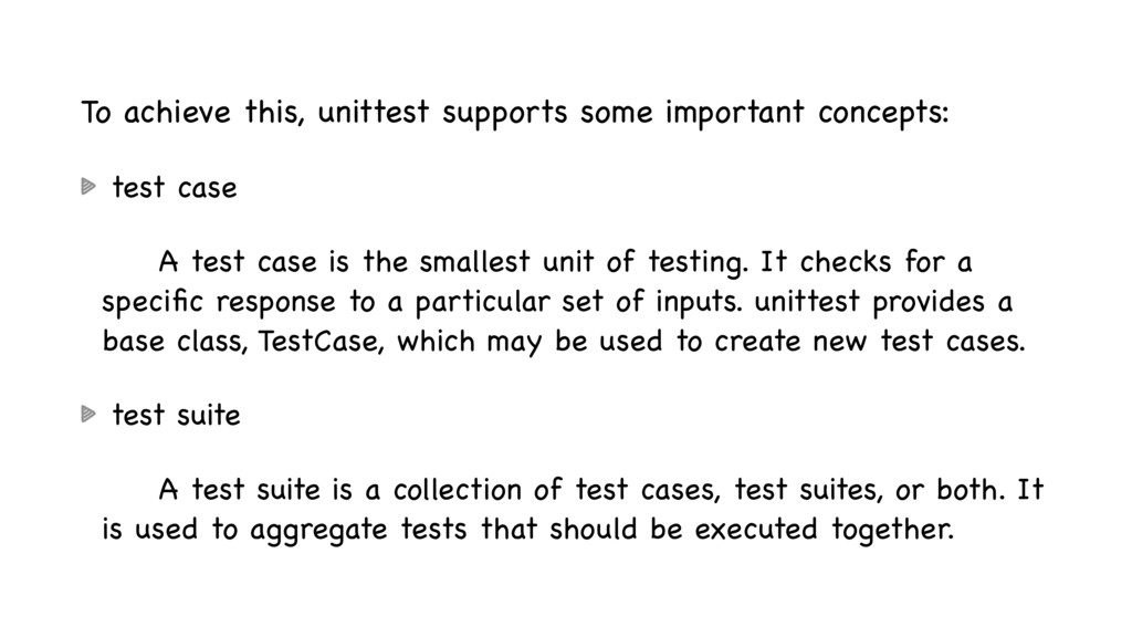A test case is the smallest unit of testing. It checks for a specific response to a particular set of inputs. unittest provides a base class, TestCase, which may be used to create new test cases. test suite A test suite is a collection of test cases, test suites, or both. It is used to aggregate tests that should be executed together.