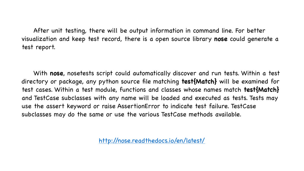 line. For better visualization and keep test record, there is a open source library nose could generate a test report. With nose, nosetests script could automatically discover and run tests. Within a test directory or package, any python source file matching test{Match} will be examined for test cases. Within a test module, functions and classes whose names match test{Match} and TestCase subclasses with any name will be loaded and executed as tests. Tests may use the assert keyword or raise AssertionError to indicate test failure. TestCase subclasses may do the same or use the various TestCase methods available. http:/ /nose.readthedocs.io/en/latest/