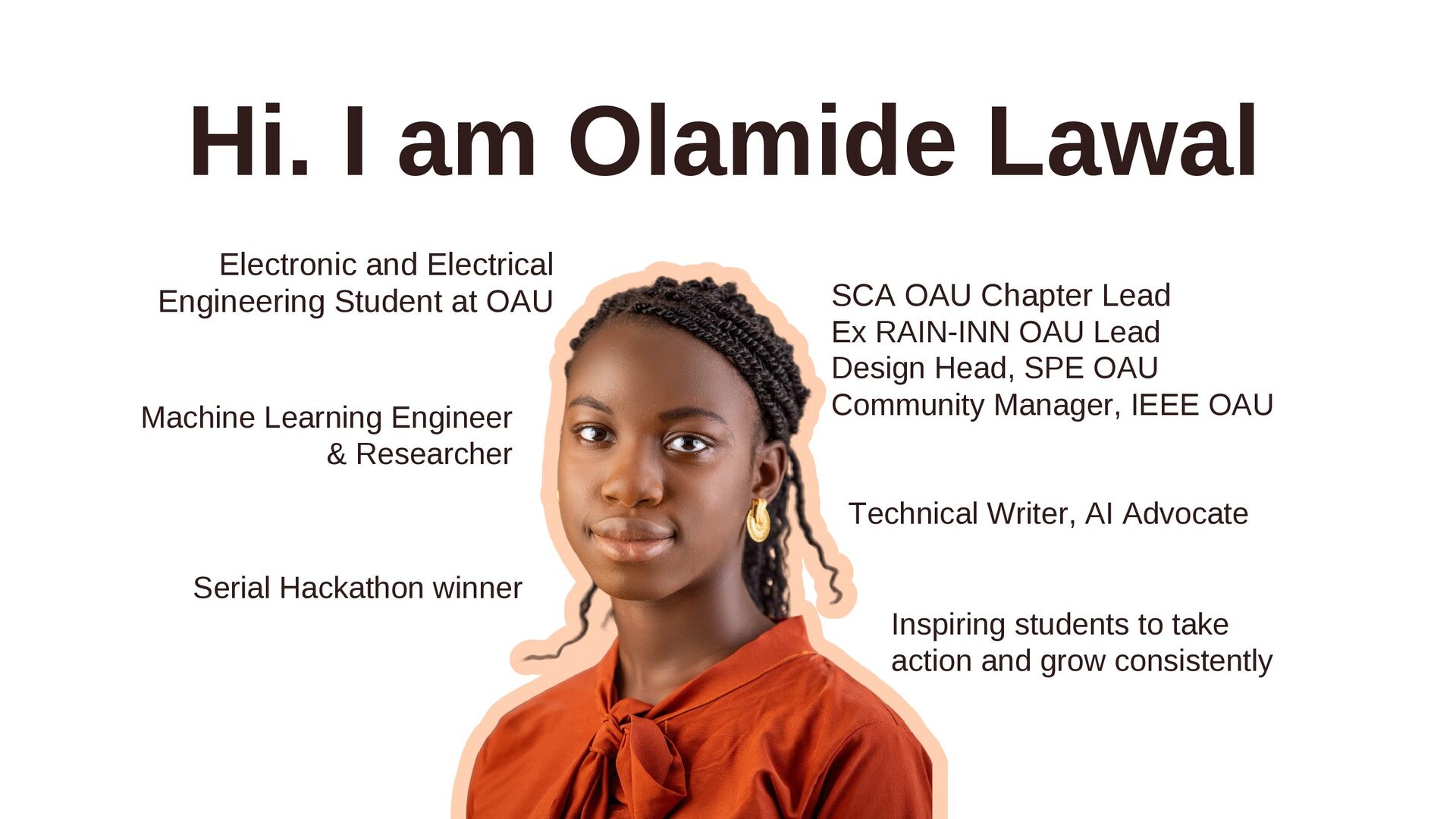 Lead Ex RAIN-INN OAU Lead Machine Learning Engineer & Researcher Serial Hackathon winner Design Head, SPE OAU Inspiring students to take action and grow consistently Community Manager, IEEE OAU Technical Writer, AI Advocate Hi. I am Olamide Lawal