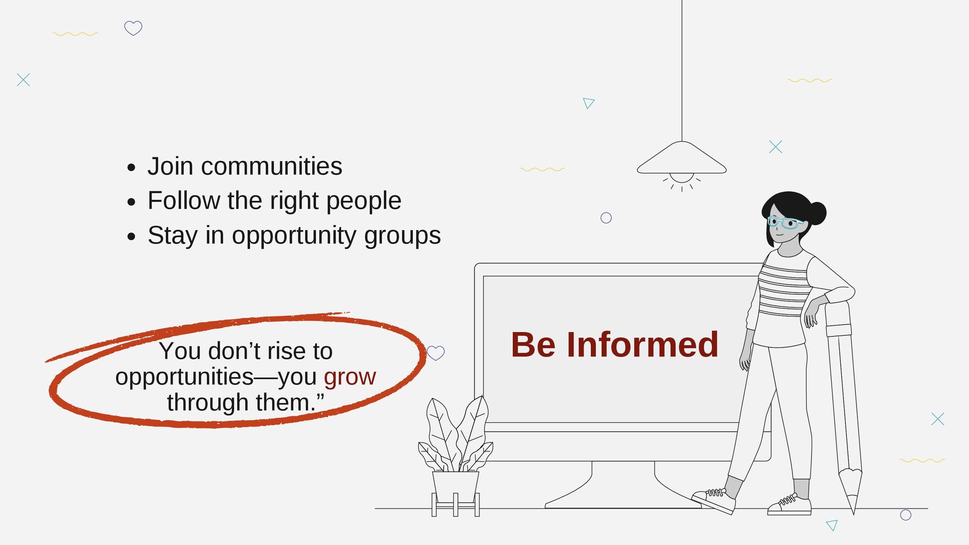 You don’t rise to opportunities—you grow through them.” Be Informed