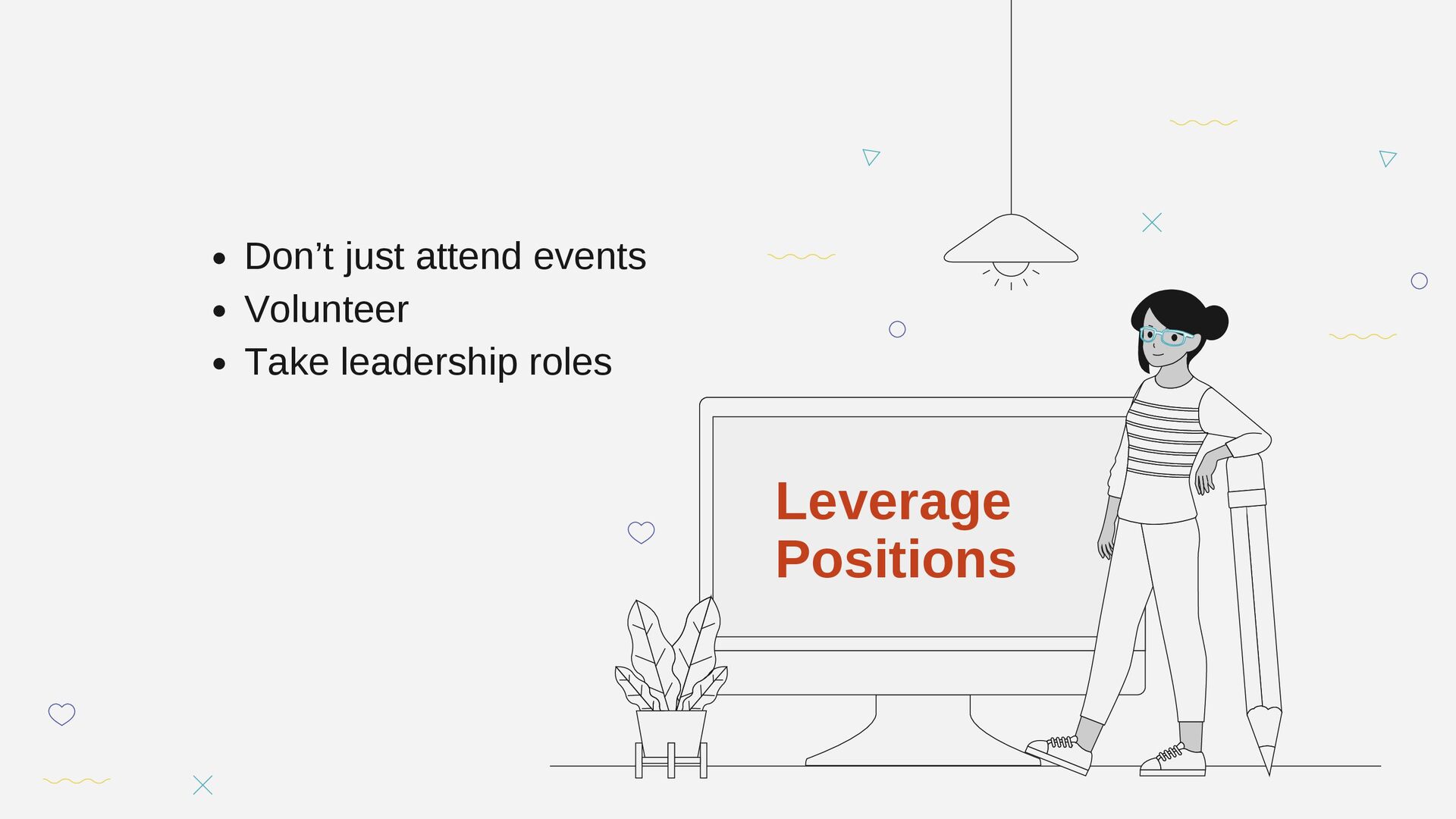 Don’t just attend events Volunteer Take leadership roles Leverage Positions