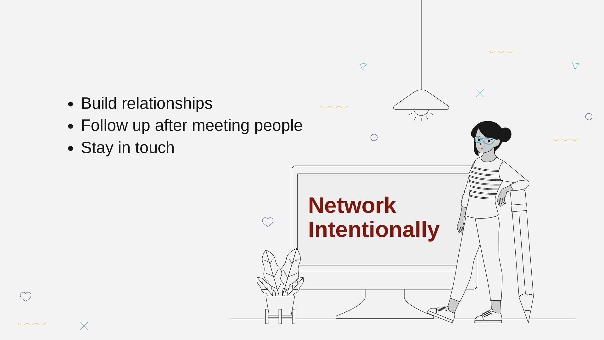 Build relationships Follow up after meeting people Stay in touch