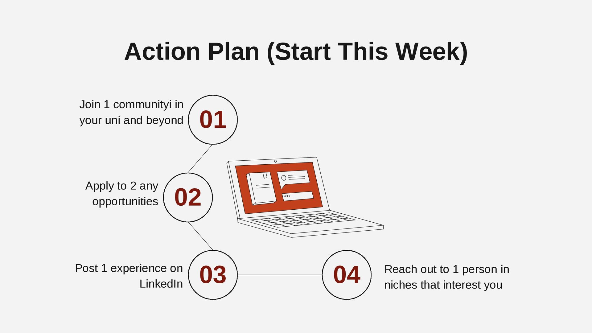 your uni and beyond Apply to 2 any opportunities Post 1 experience on LinkedIn Reach out to 1 person in niches that interest you 03 02 04