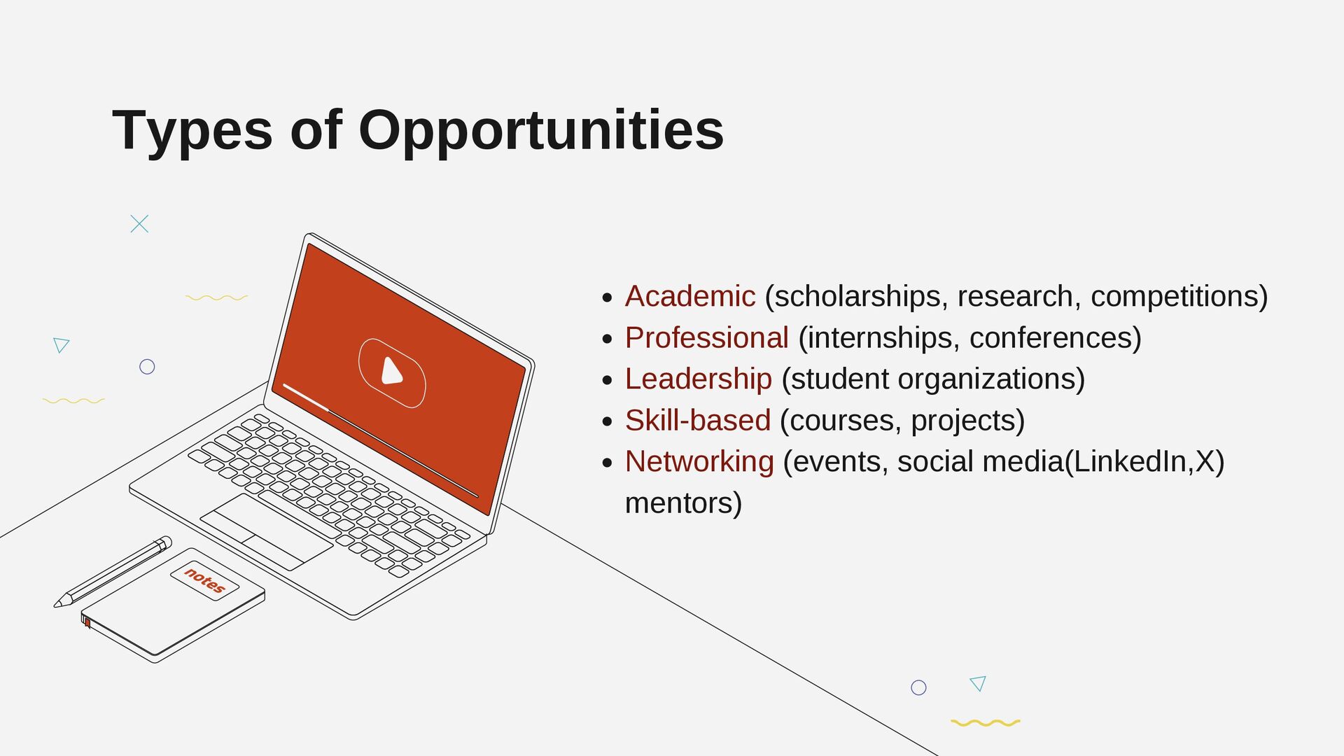 Types of Opportunities Academic (scholarships, research, competitions) Professional (internships, conferences)