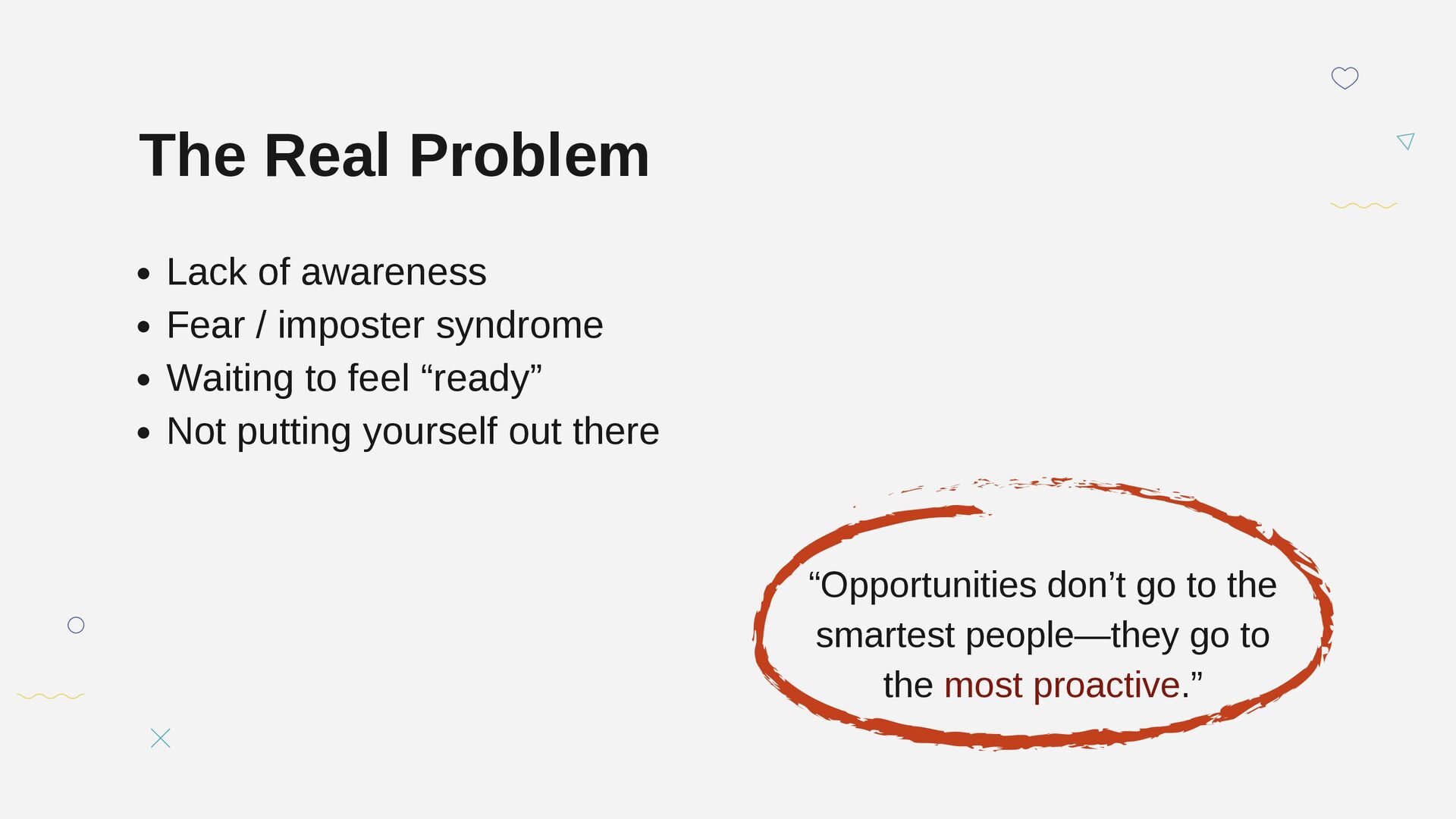 Waiting to feel “ready” Not putting yourself out there “Opportunities don’t go to the smartest people—they go to the most proactive.”