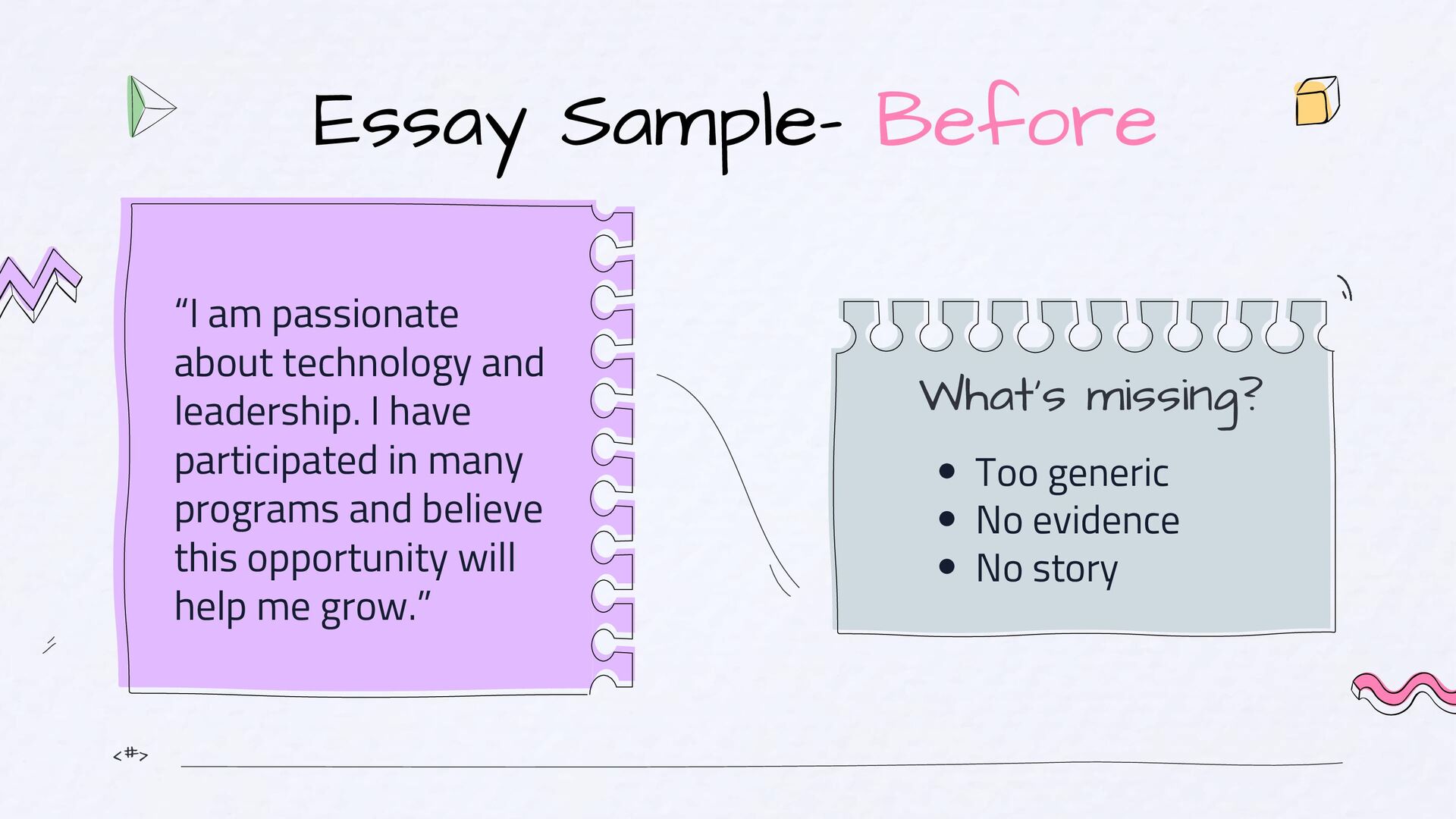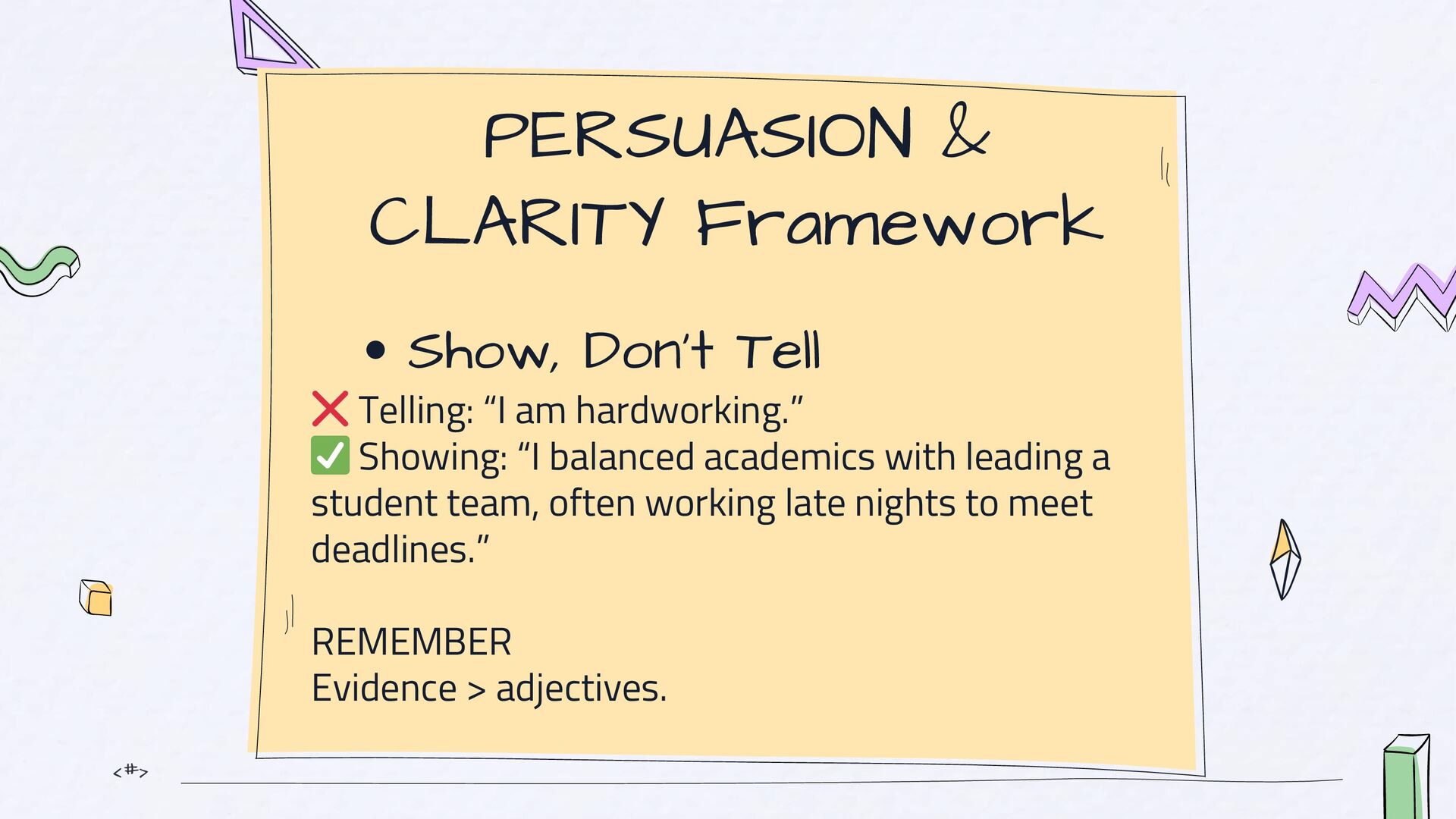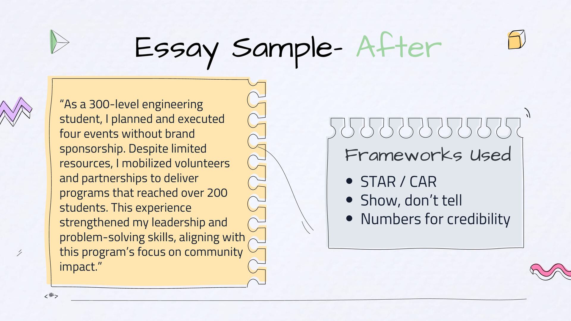 should be: Simple, Clear and Human. If they need to reread it, you’ve lost them. The “So What?” Test After every paragraph, ask: “So what? Why should they care?” The 3C Check Before submitting, check if your essay is Clear, Concrete and Compelling Voice Test Read your essay out loud and Ask: Does this sound like me? Would I say this naturally?