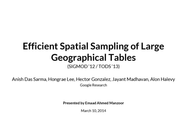 90-minute presentation at the InfoCloud (cloud.kaust.edu.sa) group meeting, on "Efficient Spatial Sampling of Large Geographical Tables" by Anish Das Sarma et al., published in SIGMOD '12 and TODS '13.