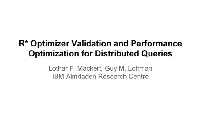 90-minute presentation for the Advanced topics in Data Management course at KAUST, on "R* Optimizer Validation and Performance Evaluation for Distributed Queries" by Mackert et al, published in VLDBJ '86.