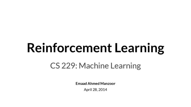 - A Set of actions - P sa State transition probabilities; a distribution over the state space - Discount factor - R Reward function of a state (or a state-action pair) Emaad Ahmed Manzoor April 28, 2014 Reinforcement Learning Markov Decision Processes