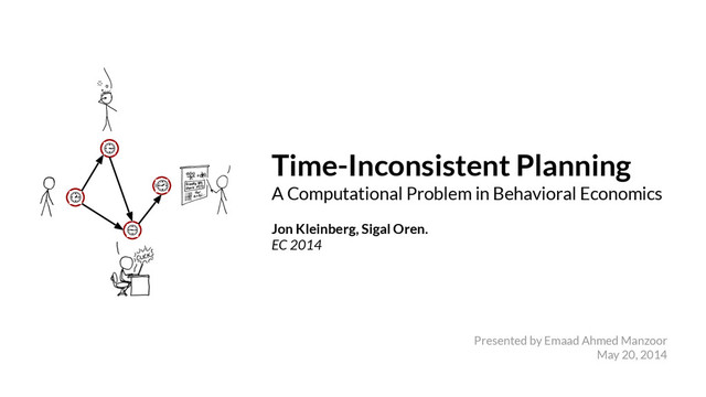 90-minute presentation at the InfoCloud (cloud.kaust.edu.sa) group meeting, on "Time-Inconsistent Planning: A Computational Problem in Behavioral Economics" by Jon Kleinberg, published in EC '14.