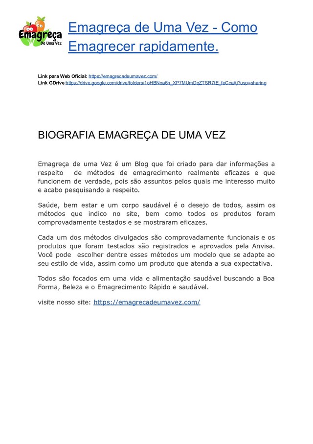 Web Oficial: https://emagrecadeumavez.com/ Link GDrive : https://drive.google.com/drive/folders/1oHBNoa6h_XP7MUmDqZTSR7tE_feCcaAj?usp=sharing BIOGRAFIA EMAGREÇA DE UMA VEZ Emagreça de uma Vez é um Blog que foi criado para dar informações a respeito de métodos de emagrecimento realmente eficazes e que funcionem de verdade, pois são assuntos pelos quais me interesso muito e acabo pesquisando a respeito. Saúde, bem estar e um corpo saudável é o desejo de todos, assim os métodos que indico no site, bem como todos os produtos foram comprovadamente testados e se mostraram eficazes. Cada um dos métodos divulgados são comprovadamente funcionais e os produtos que foram testados são registrados e aprovados pela Anvisa. Você pode escolher dentre esses métodos um modelo que se adapte ao seu estilo de vida, assim como um produto que atenda a sua expectativa. Todos são focados em uma vida e alimentação saudável buscando a Boa Forma, Beleza e o Emagrecimento Rápido e saudável. visite nosso site: https://emagrecadeumavez.com/