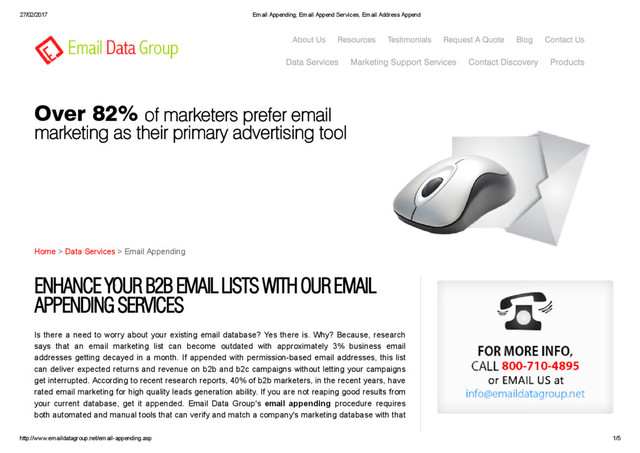 3/5 Expand Marketing Reach with Email Append In 2013, 56% of businesses increased their use of email marketing. So, get into the game with our appended email addresses and drive highly responsive email campaigns. At affordable marketing costs buy email list and give support to productive business partnerships. Our match rate for appended data is over 45%, which include email addresses that are SMTP verified, canspam compliant and follow DMA guidelines. The benefits of our appended email addresses are: optimization of crosschannel marketing improve business communication through realtime emails bulk emails sending makes diverse audience reach possible increase in the response, lead counts and revenue from email activities Our worldclass email append services deliver current email IDs that belong to mailing addresses under specific customer demographics. In every possibility, marketers can follow customer behavior and buying trends with the help of our email address appended data that employs allpurpose profile identification. Few of the categories we cover are: Email, Phone, Fax, ZIP Code, SIC Code, License, Industry, Company, Revenue, Web Address, etc. The appended email lists belong to highranking professionals from smallsized to bigsized companies across industries. The industries we cover are Financial Services, Education, Technology, Insurance, Advertising, Healthcare, Retail, Travel, Agriculture, Banking, Real Estate, etc. Email Appending Services Differentiate Good Database from Bad Most email append providers across nations are of high repute, though as a buyer you can make sure whether their services are what you need at the price stated by them and at the time mentioned by them. Well, it is not difficult to differentiate between a bad email address appending provider and a good one. There are a few questions you need ask your vendor while investing in an email data append service: What is the email append match rate you are offering? Who are you offering your services to off late?