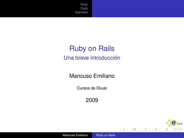 es Rails Framework de aplicaciones web escrito en Ruby Paradigma MVC Modelo Clases que representan el modelo en la base de datos Vista Controlador Mancuso Emiliano Ruby on Rails