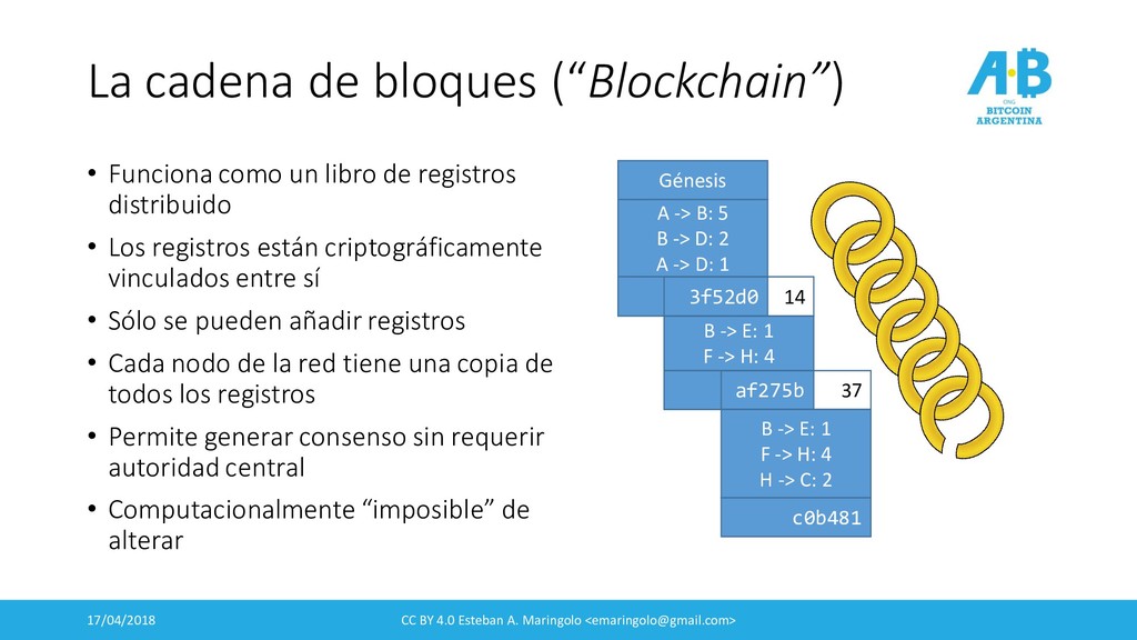 de registros distribuido • Los registros están criptográficamente vinculados entre sí • Sólo se pueden añadir registros • Cada nodo de la red tiene una copia de todos los registros • Permite generar consenso sin requerir autoridad central • Computacionalmente “imposible” de alterar A -> B: 5 B -> D: 2 A -> D: 1 Génesis 3f52d0 B -> E: 1 F -> H: 4 14 af275b B -> E: 1 F -> H: 4 H -> C: 2 37 c0b481 17/04/2018 CC BY 4.0 Esteban A. Maringolo <[email protected]>