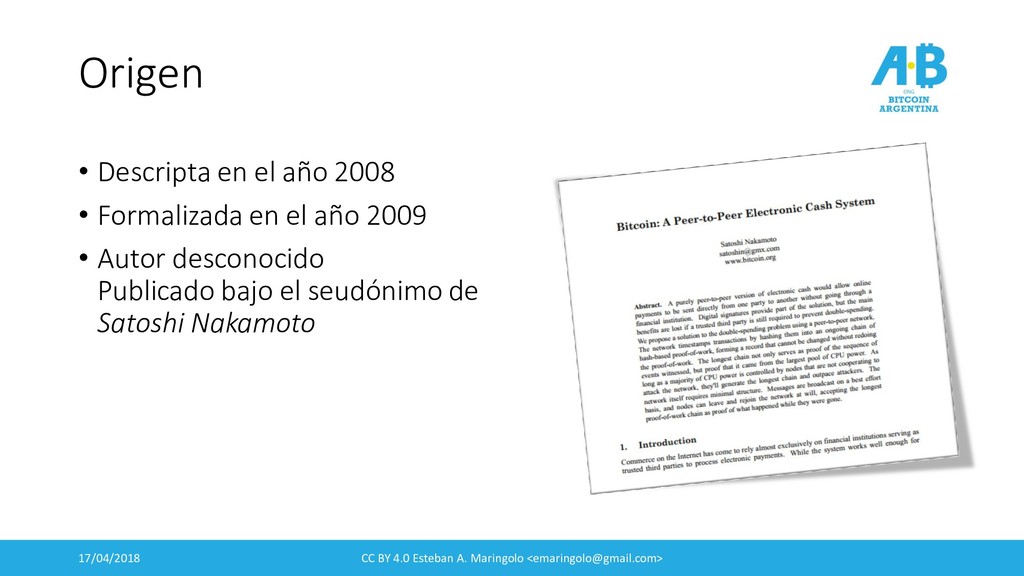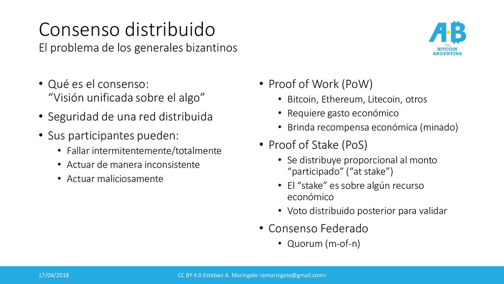 es el consenso: “Visión unificada sobre el algo” • Seguridad de una red distribuida • Sus participantes pueden: • Fallar intermitentemente/totalmente • Actuar de manera inconsistente • Actuar maliciosamente • Proof of Work (PoW) • Bitcoin, Ethereum, Litecoin, otros • Requiere gasto económico • Brinda recompensa económica (minado) • Proof of Stake (PoS) • Se distribuye proporcional al monto “participado” (“at stake”) • El “stake” es sobre algún recurso económico • Voto distribuido posterior para validar • Consenso Federado • Quorum (m-of-n) 17/04/2018 CC BY 4.0 Esteban A. Maringolo <[email protected]>