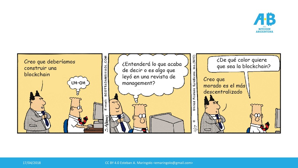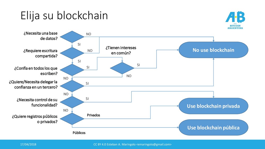 blockchain privada ¿Necesita una base de datos? ¿Requiere escritura compartida? ¿Confía en todos los que escriben? ¿Quiere/Necesita delegar la confianza en un tercero? ¿Necesita control de su funcionalidad? ¿Quiere registros públicos o privados? SI SI NO NO NO Públicos SI NO SI Privados NO SI SI NO ¿Tienen intereses en común? 17/04/2018 CC BY 4.0 Esteban A. Maringolo <[email protected]>