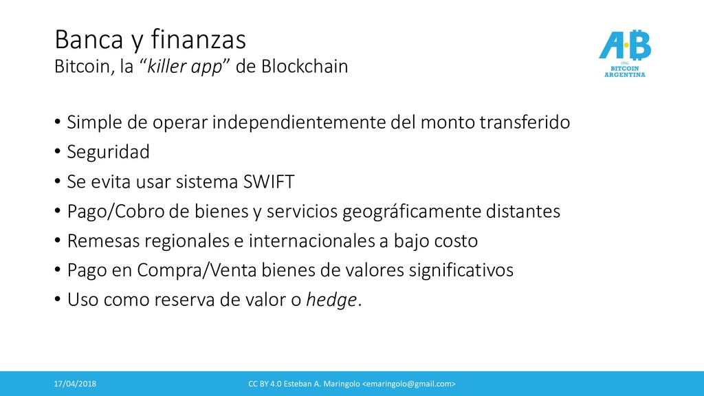 Simple de operar independientemente del monto transferido • Seguridad • Se evita usar sistema SWIFT • Pago/Cobro de bienes y servicios geográficamente distantes • Remesas regionales e internacionales a bajo costo • Pago en Compra/Venta bienes de valores significativos • Uso como reserva de valor o hedge. 17/04/2018 CC BY 4.0 Esteban A. Maringolo <[email protected]>