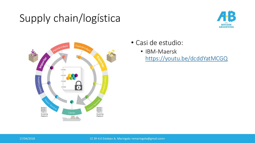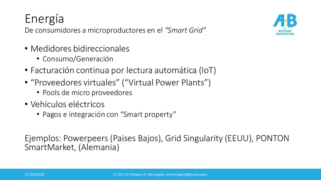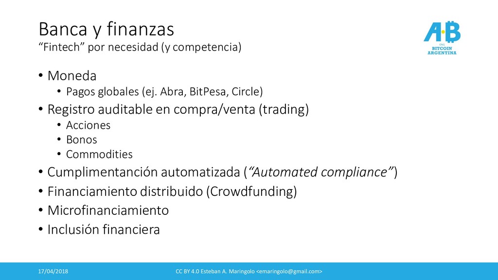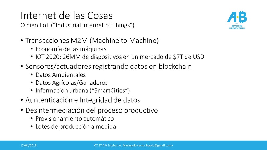 Things”) • Transacciones M2M (Machine to Machine) • Economía de las máquinas • IOT 2020: 26MM de dispositivos en un mercado de $7T de USD • Sensores/actuadores registrando datos en blockchain • Datos Ambientales • Datos Agrícolas/Ganaderos • Información urbana (“SmartCities”) • Auntenticación e Integridad de datos • Desintermediación del proceso productivo • Provisionamiento automático • Lotes de producción a medida 17/04/2018 CC BY 4.0 Esteban A. Maringolo <[email protected]>