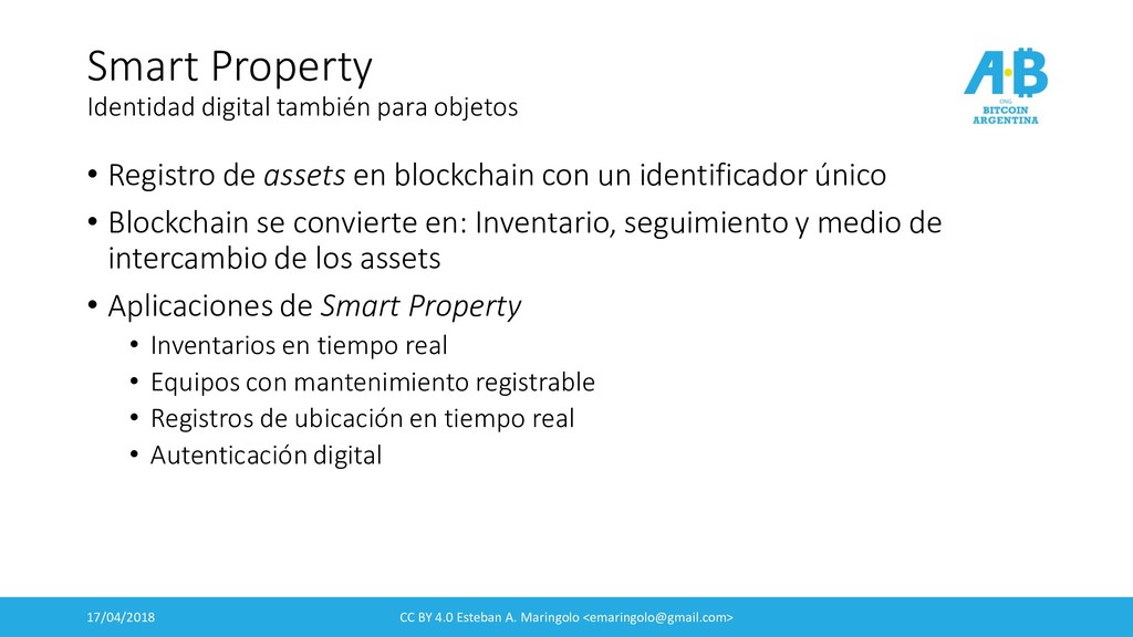 assets en blockchain con un identificador único • Blockchain se convierte en: Inventario, seguimiento y medio de intercambio de los assets • Aplicaciones de Smart Property • Inventarios en tiempo real • Equipos con mantenimiento registrable • Registros de ubicación en tiempo real • Autenticación digital 17/04/2018 CC BY 4.0 Esteban A. Maringolo <[email protected]>