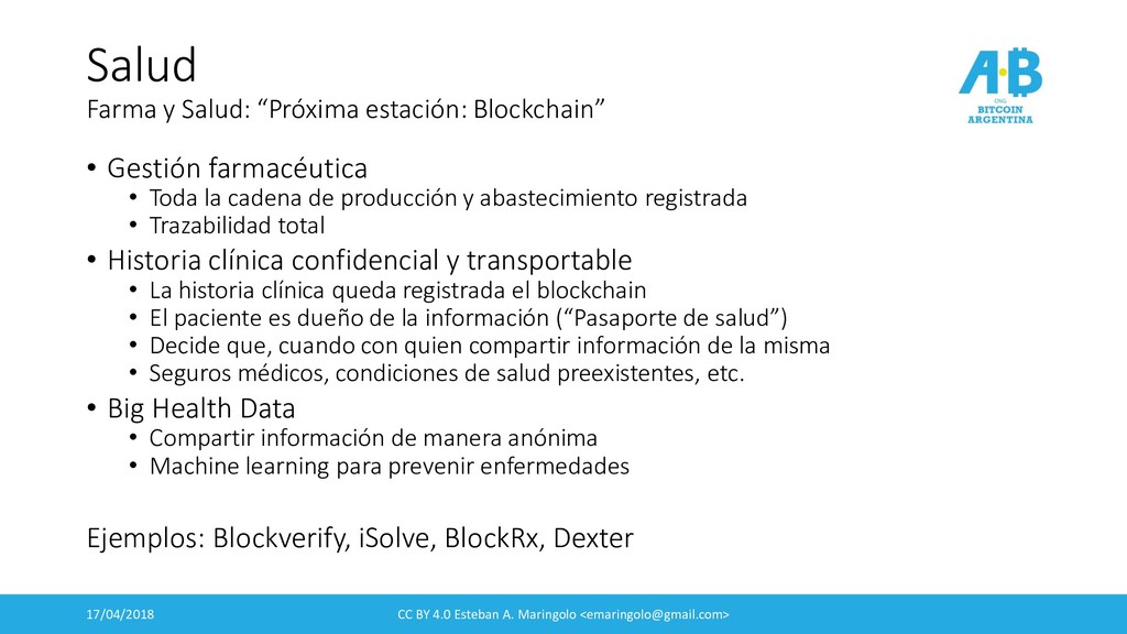 • Toda la cadena de producción y abastecimiento registrada • Trazabilidad total • Historia clínica confidencial y transportable • La historia clínica queda registrada el blockchain • El paciente es dueño de la información (“Pasaporte de salud”) • Decide que, cuando con quien compartir información de la misma • Seguros médicos, condiciones de salud preexistentes, etc. • Big Health Data • Compartir información de manera anónima • Machine learning para prevenir enfermedades Ejemplos: Blockverify, iSolve, BlockRx, Dexter 17/04/2018 CC BY 4.0 Esteban A. Maringolo <[email protected]>