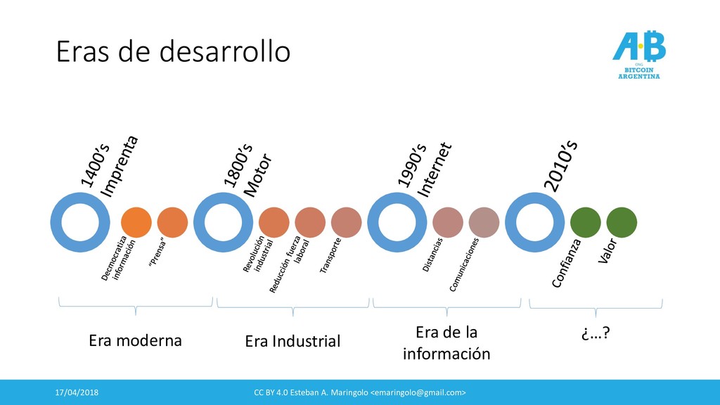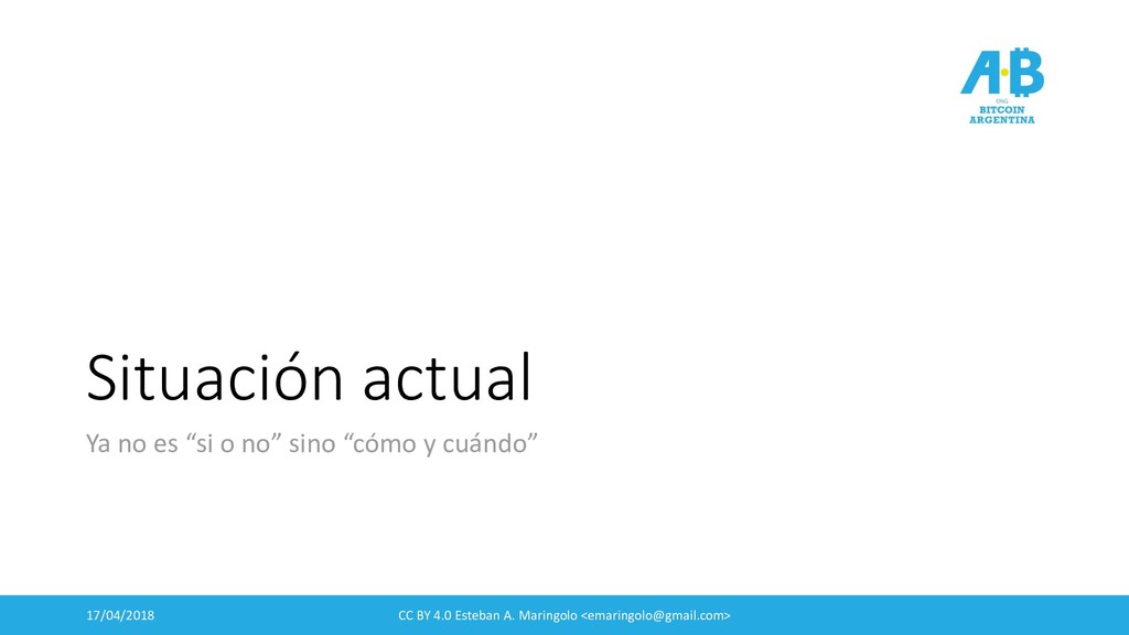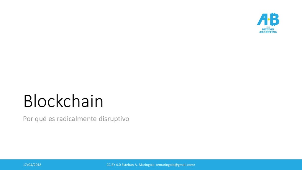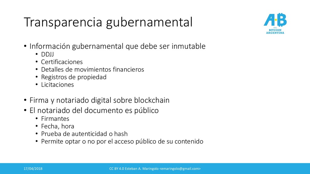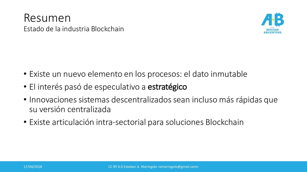 elemento en los procesos: el dato inmutable • El interés pasó de especulativo a estratégico • Innovaciones sistemas descentralizados sean incluso más rápidas que su versión centralizada • Existe articulación intra-sectorial para soluciones Blockchain 17/04/2018 CC BY 4.0 Esteban A. Maringolo <[email protected]>