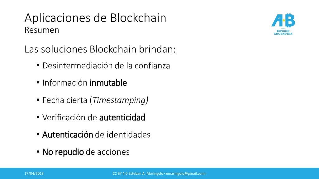 de la confianza • Información inmutable • Fecha cierta (Timestamping) • Verificación de autenticidad • Autenticación de identidades • No repudio de acciones 17/04/2018 CC BY 4.0 Esteban A. Maringolo <[email protected]>