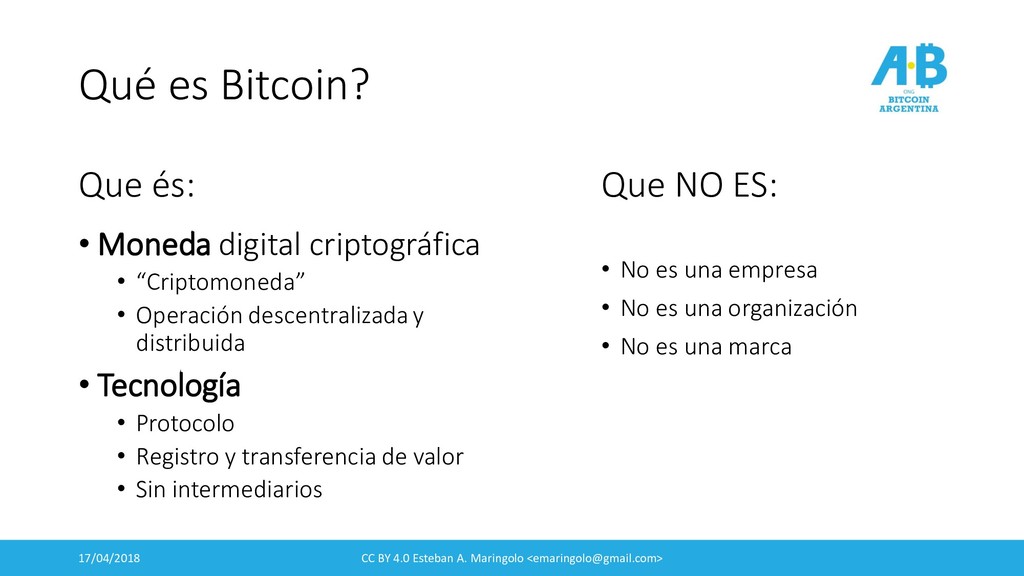 “Criptomoneda” • Operación descentralizada y distribuida • Tecnología • Protocolo • Registro y transferencia de valor • Sin intermediarios Que NO ES: • No es una empresa • No es una organización • No es una marca 17/04/2018 CC BY 4.0 Esteban A. Maringolo <[email protected]>