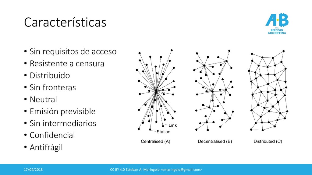 Pseudoanónimas • Descentralizadas • Asset nativos • Soluciones radicalmente diferentes a problemas existentes • Dominio público • Abierta y transparente • Registros públicos y auditables • Alegal (No regulado ni prohibido) • Ejemplos • Bitcoin • Ethereum • EOS 17/04/2018 CC BY 4.0 Esteban A. Maringolo <[email protected]>